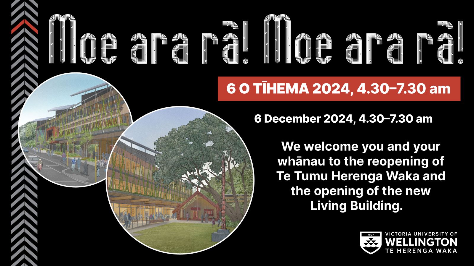 Te Herenga Waka—Victoria University of Wellington welcomes you to the reopening of Te Tumu Herenga Waka and the opening of the new accompanying Living Building.