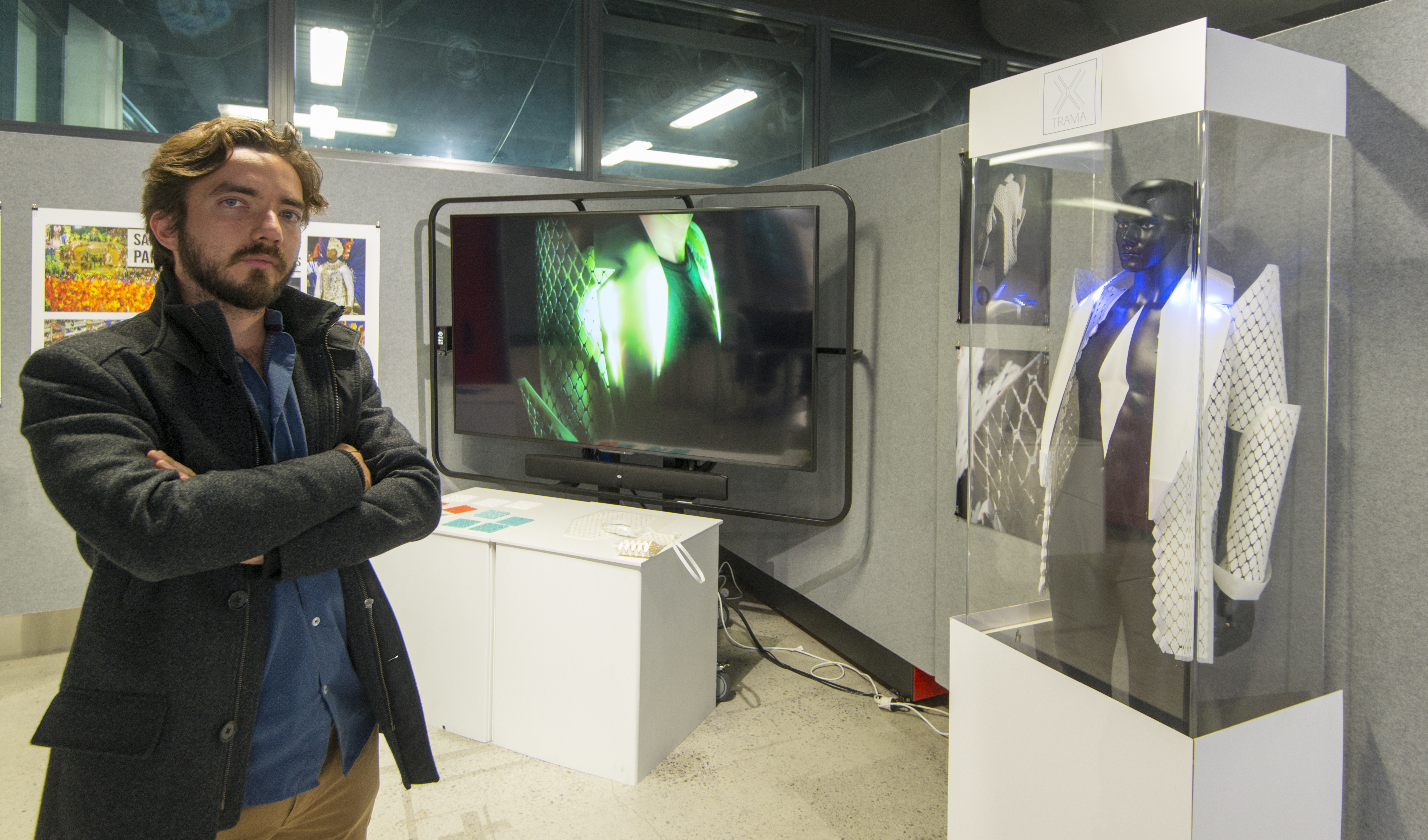 Student Luca Riberio’s work TRAMA is a redesign of a traditional Brazilian Carnaval costume. It uses fashion, industrial, and costume design to explore new garment options that are sustainable and looks at new alternatives to the wasteful production cycles attributed to traditional Carnaval costume production. Luca’s work also uses 3D printing to create a fully recyclable textile that behaves like fabric.