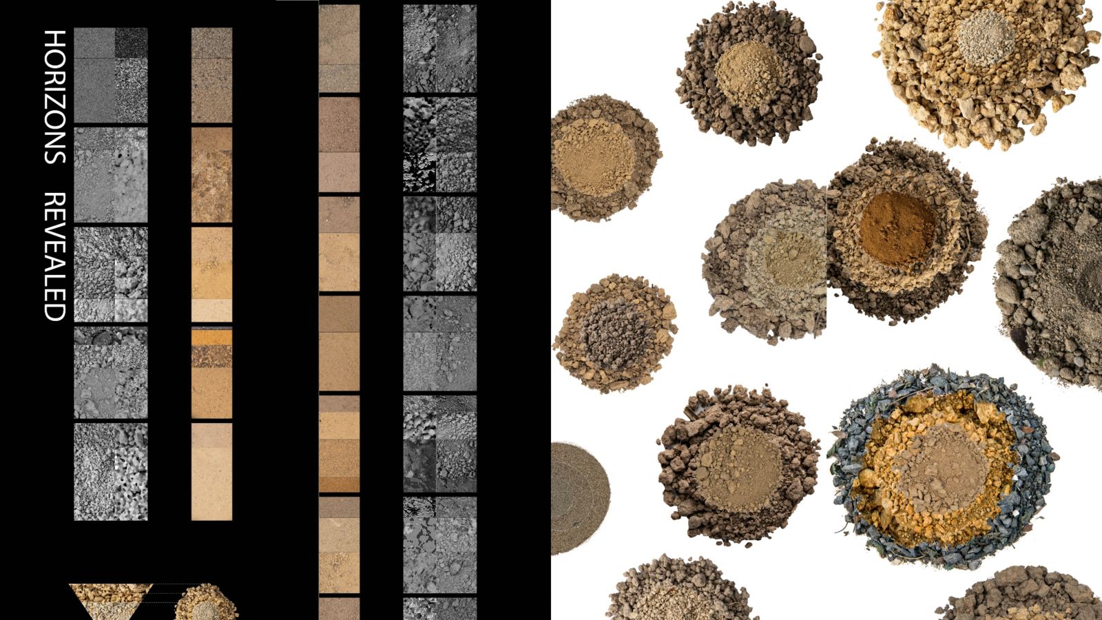 - Soil textures and structure: The black and white reverse sides of the lightboxes remove all pigment from the soils to reveal their values (saturation) and their textures first without modification and then using levels of abstraction.