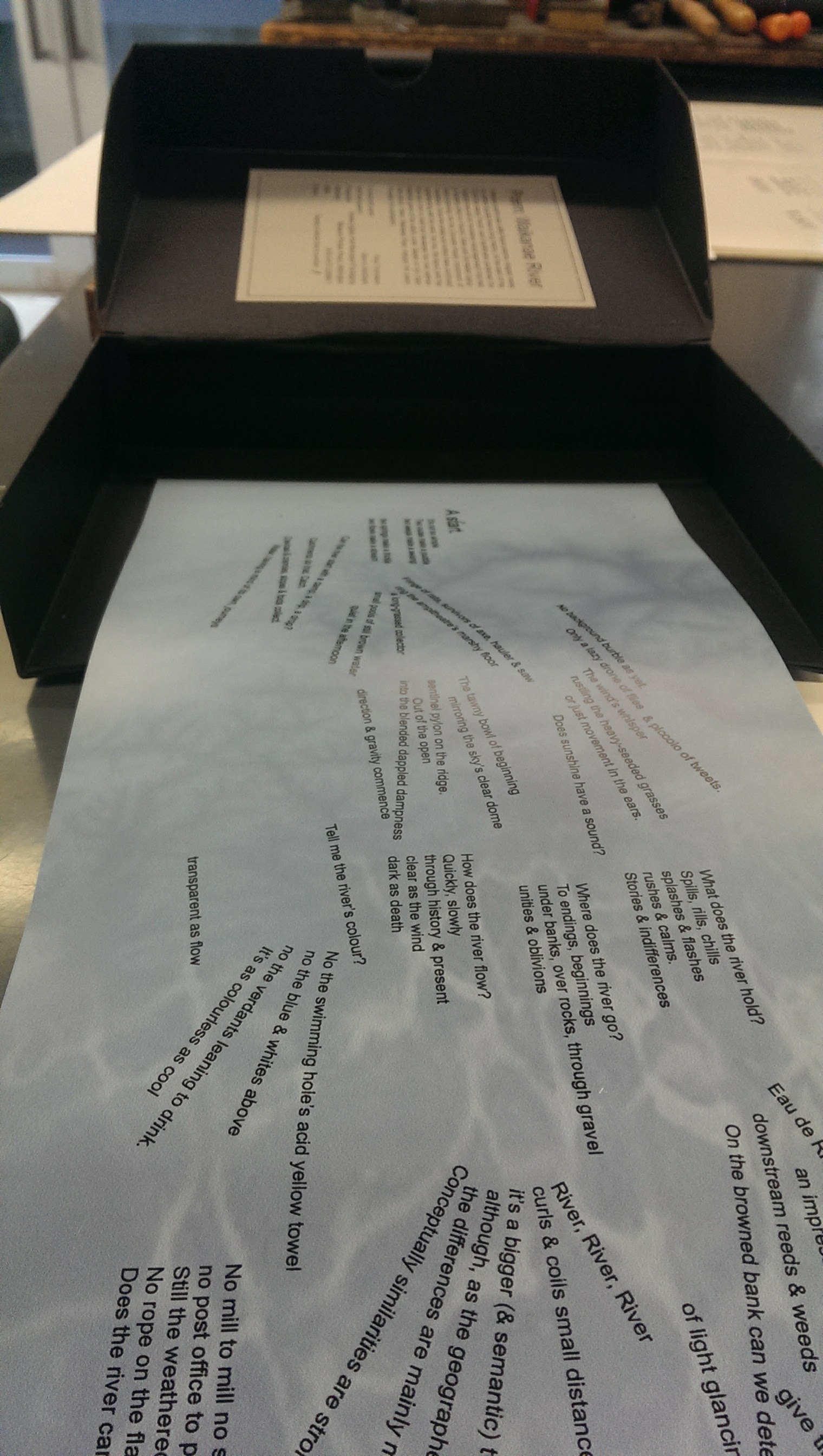 2015: Museum Photon Press, Waikanae ; production by Kinetic Digital ; Port Nicolson Packaging Wellington. Scroll unfurls from a box to reveal poem. Limited edition of 20.